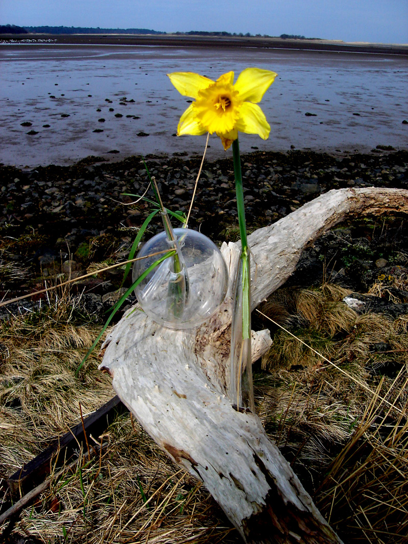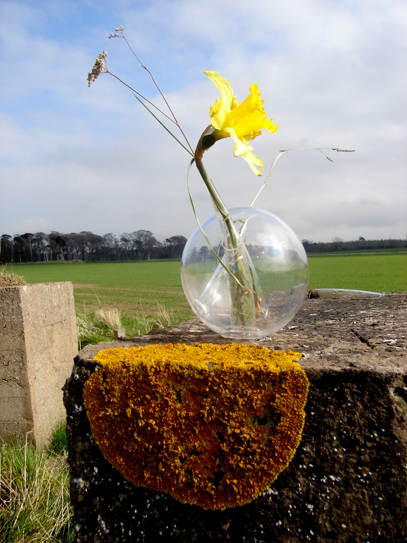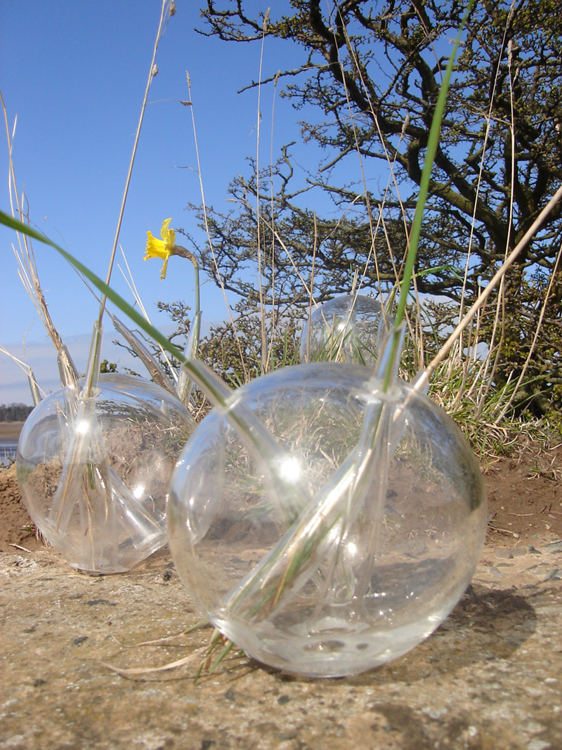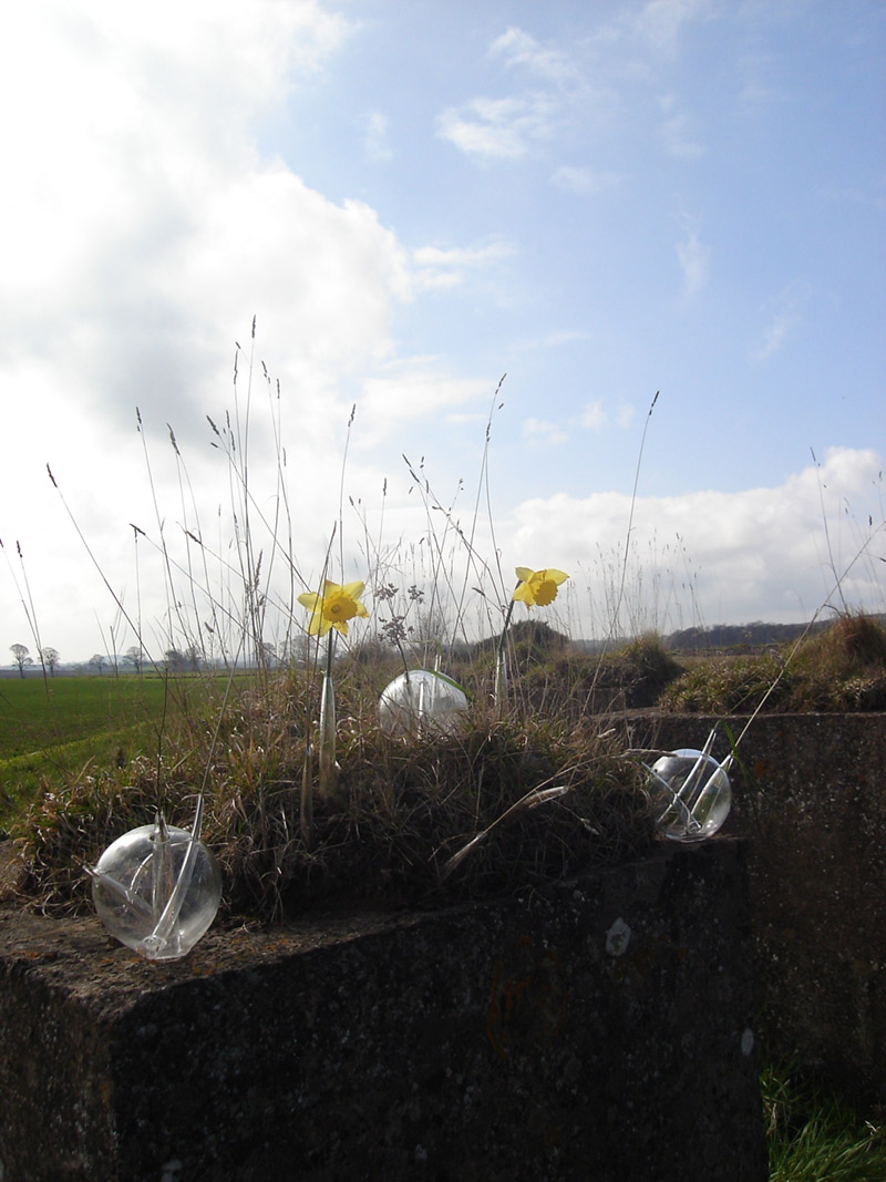 Tras recorrer las periferias de Dunbar en Escocia, me encontré con una trinchera de guerra hecha a partir de bloques masivos de concreto en hermosos rectángulos. Gracias a la lluvia se ha dado lugar a la coexistencia entre la naturaleza y lo fabricado por el hombre, entre lo delicado de las flores y el pasto y lo corpulento de los bloques de concreto. La obra es una alusión a las gotas de agua que hacen posible esta correlación entre la naturaleza y la creación del hombre. Drops son unas gotas de agua agrandadas de vidrio, por la cual aparecen unos conductos de vidrio que abren el espacio a la naturaleza. Estas gotas de agua crean un paisaje integrado entre el verde del parque y el concreto de los bloques.