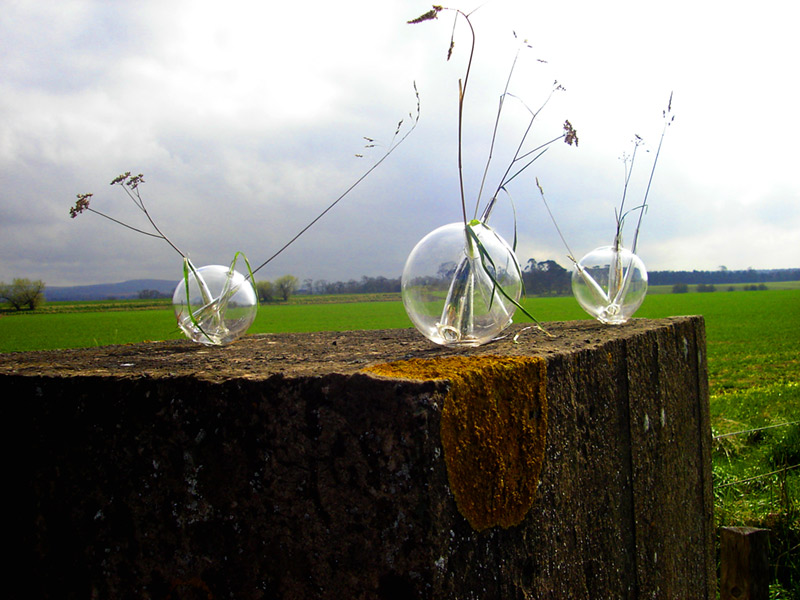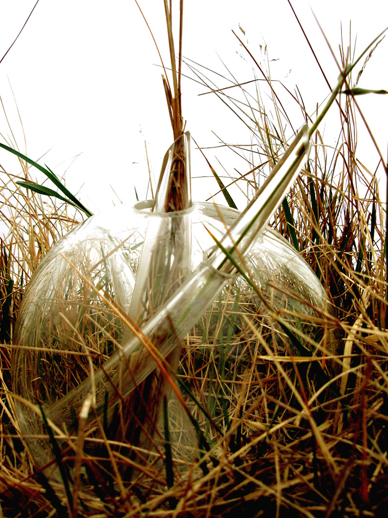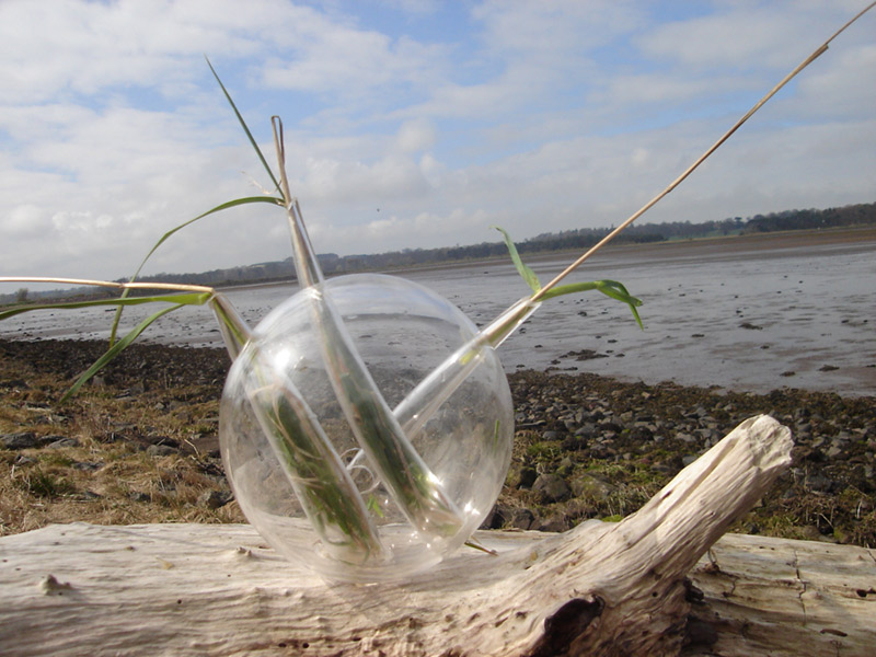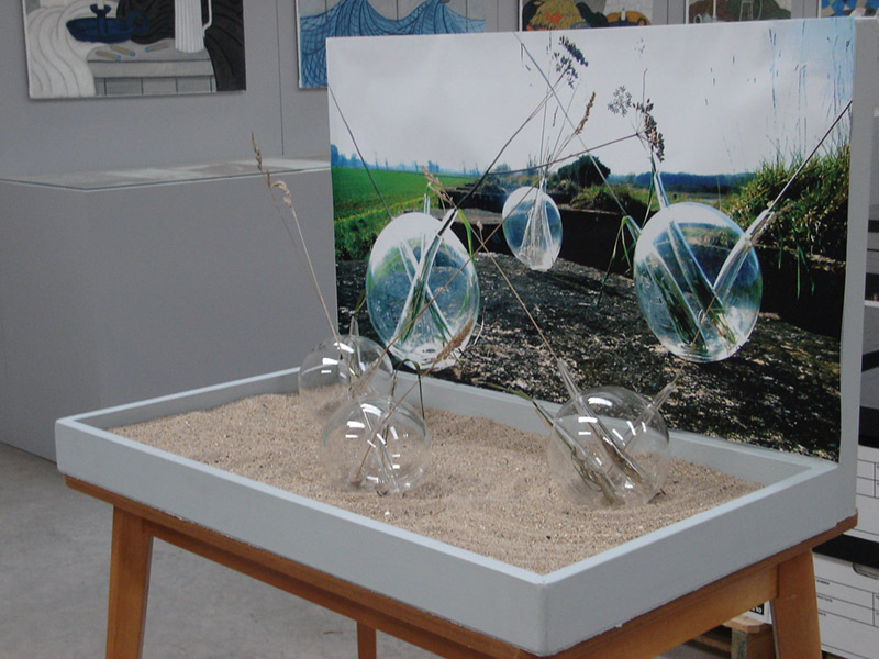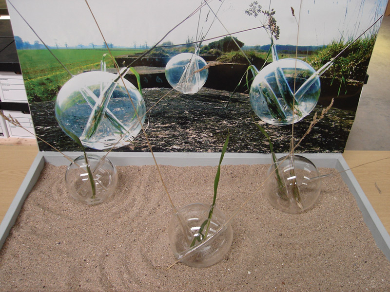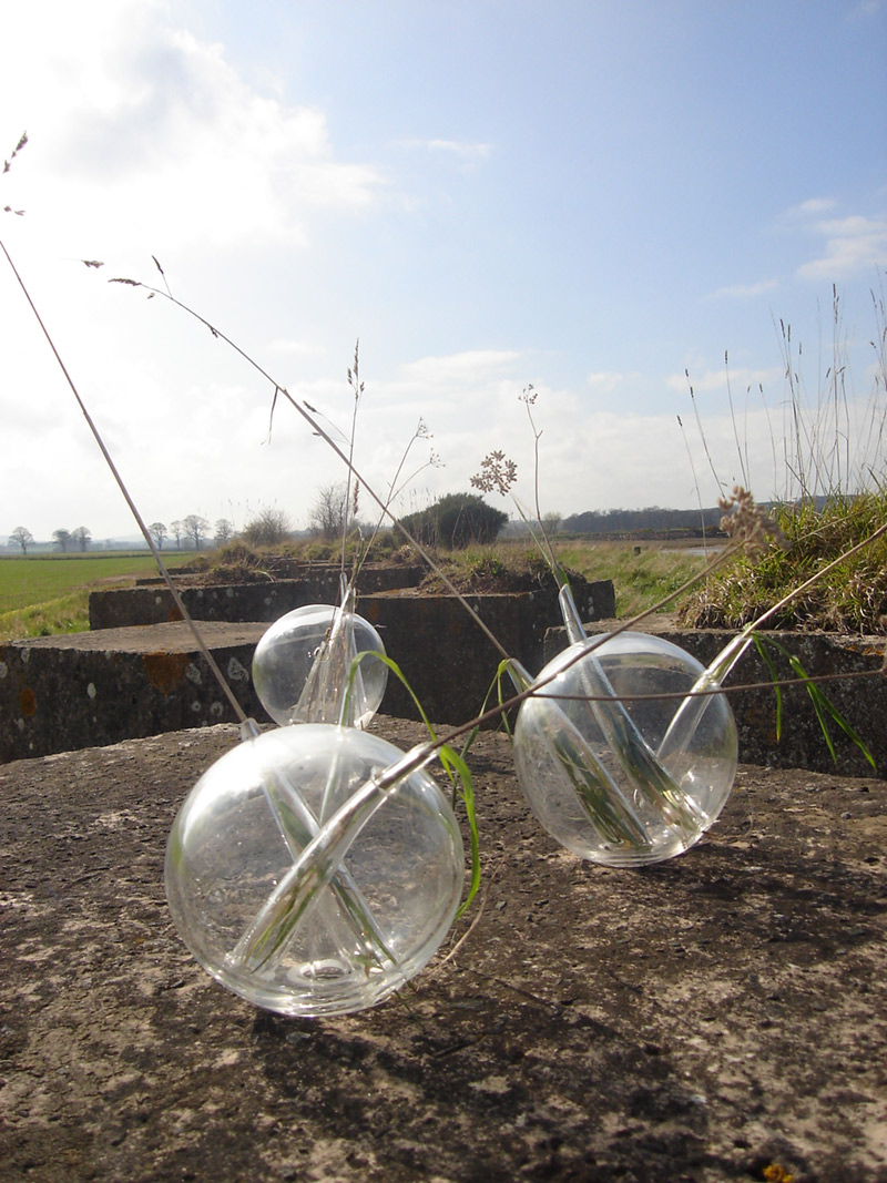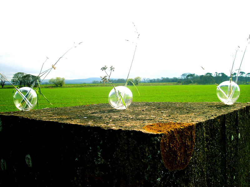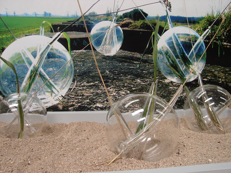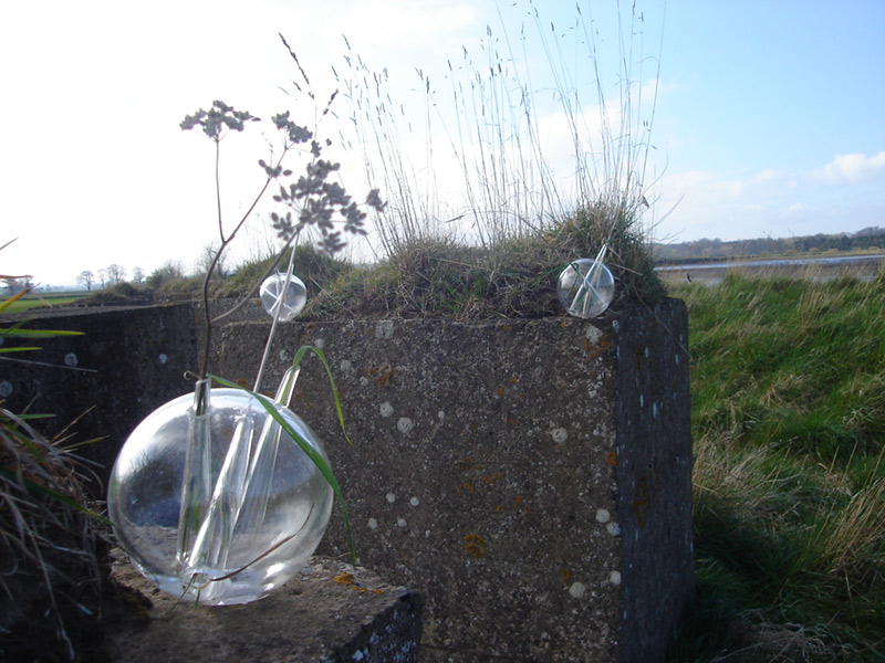 After a walk through the outskirts of Dunbar in Scotland, I found a war trench made of colossal concrete blocks, in beautiful rectangles. Thanks to the rain, I realized that nature can to coexist with the human construction; the rain creates a link between the delicacy of the grass and flowers among the massiveness of the concrete blocks. This piece is an allusion to the drops of water which made possible the correlation between nature and the human creation. Drops are several resized drops of water in glass, where some glass conducts opens the space to nature. These drops of water create an integrated landscape between the green park and the concrete blocks.